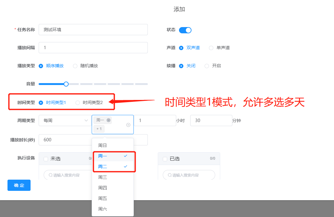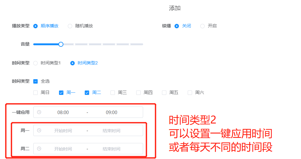 【产品教程】-基础 2025.12.03 AVG 语音设置-广播设置 '环境说明' 系统版本:C01V02R003P230414 注意事项: '1:若是免摘的IP音响默认也是执行接听音乐后, IP音响允许被拨打呼入,然后进行紧急通话喊话,喊完话后挂断后音乐继续播放!!' 广播设置 1.添加广播分机( 保持注册成功 )  2.添加广播任务 (设置好对应的时间点 和播放时长 )  3.选择哪些播放和播放什么音乐。  案例1: 时间类型1 介绍,允许设置 多天选项,指定时间然后开始播放多少秒的方式!~  案例2 : 时间类型2 介绍,允许设置 多天选项,分段时间自定义设置,从A到B的时间节点播放
