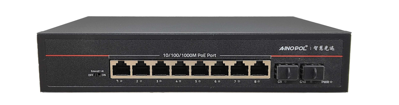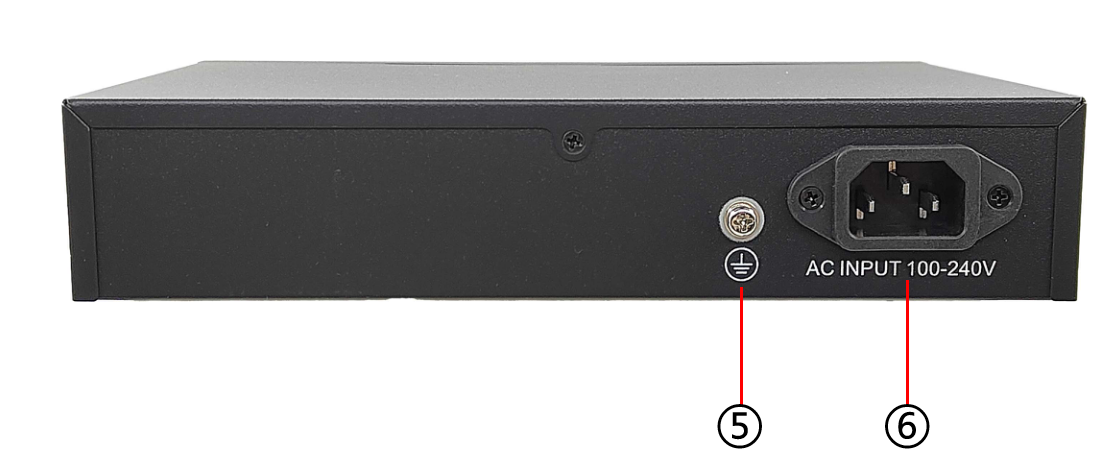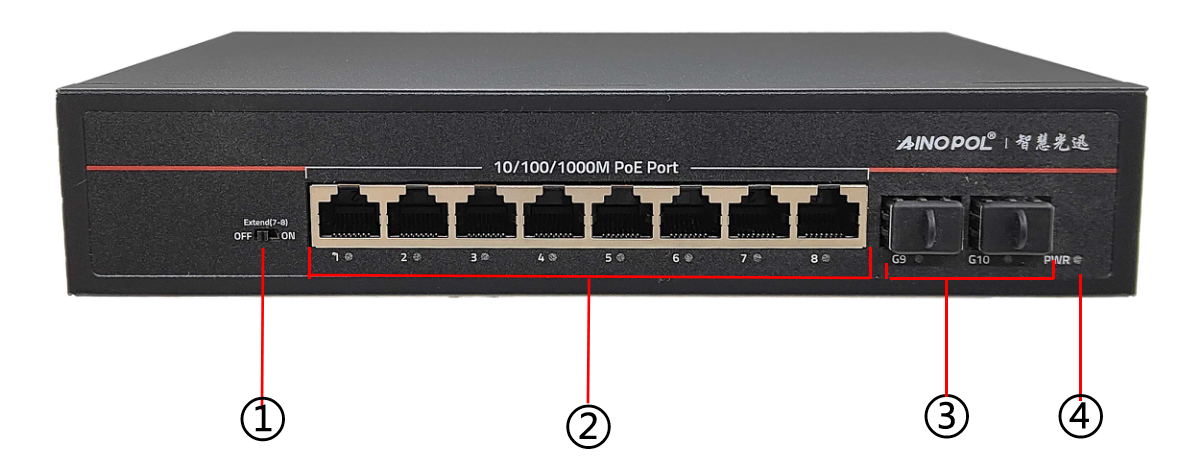 盒式交换机硬件说明 设备型号:VLAN透传型非管理POE交换机(质保3年) 8个10/100/1000M POE供电网口 2个千兆SFP光口 桌面式 背板带宽20Gbps IEEE 802.3af/at国际标准 功耗:≤120W 产品尺寸:220\*161\*44mm 工作温度:-10℃~50℃ AC110-240V 净重:0.85KG 产品外观及硬件规格说明:  图1 ZH-CS2010-PWR产品正面  图2 ZH-CS2010-PWR产品背面 1、接口说明  ①:Extend挡位:超巨开启后7-8口供电距离突破100米限制 ②:网络接口:8个10/100/1000M POE供电网口 ③:网络接口:2个SFP光口 ④:PWR指示灯:设备电源指示灯  ⑤:接地 ⑥:电源接口:需接入AC 220V 电源。