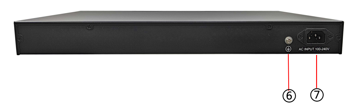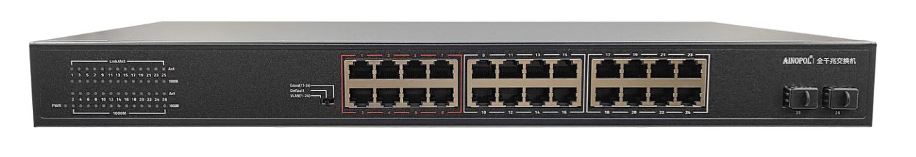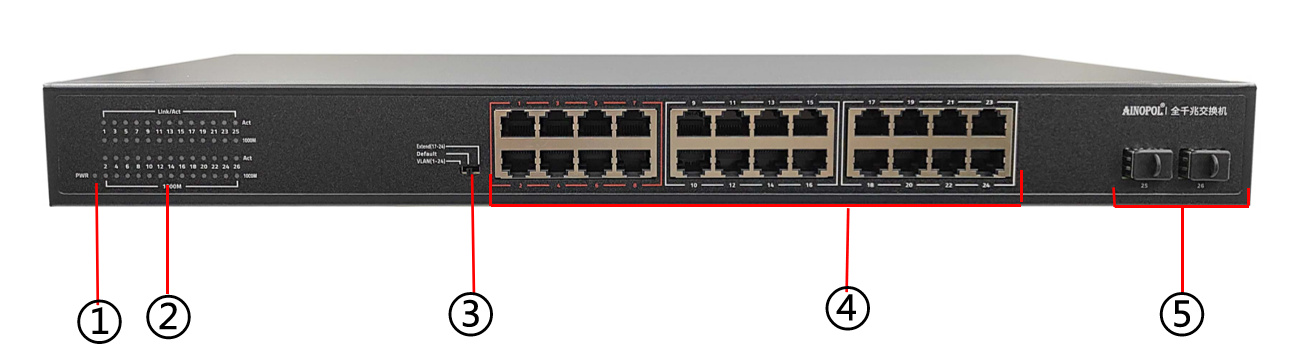 盒式交换机硬件说明 设备型号:VLAN透传型非管理交换机(质保3年) 1U机架式 24个10/100/1000M网口 2个千兆SFP光口 交换容量52Gbps 包转发率38.68Mpps MAC地址表8K 功耗:≤40W 工作温度:-10℃~50℃ AC 100-240V 尺寸:440\*280\*44mm 净重:2.35KG 产品外观及硬件规格说明:  图1 ZH-SW1024S产品正面  图2 ZH-SW1024S产品背面 1、接口说明  ①:PWR指示灯:设备电源指示灯 ②:网络接口指示灯:端口接线状态灯 ③:拨片:1、Extend挡位:此挡位可使17-24口传输距离突破100米达到更远距离。2、Default挡位:此挡位默认端口全互通。3、VLAN挡位:此挡位可使1-24端口隔离 ④:网络接口:24个10/100/1000M网口 ⑤:网络接口:2个千兆SFP光口  ⑥:接地 ⑦:电源接口:需接入AC 220V 电源。
