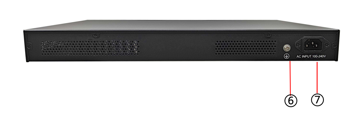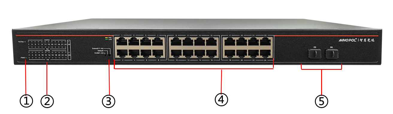 盒式交换机硬件说明 设备型号:VLAN透传型非管理POE交换机(质保3年) 1U机架式 24个10/100/1000M POE供电网口 2个千兆SFP光口 交换容量52Gbps 包转发率38.68Mpps MAC地址表8K 功耗:≤400W 工作温度:-10℃~50℃ AC 100-240V 尺寸:440\*280\*44mm 净重:3.1KG 产品外观及硬件规格说明:  图1 ZH-SW1024S产品正面  图2 ZH-SW1024S产品背面 1、接口说明  ①:PWR指示灯:设备电源指示灯 ②:网络接口指示灯:端口接线状态灯 ③:拨片:1、Extend挡位:此挡位可使17-24口传输距离突破100米达到更远距离。2、Default挡位:此挡位默认端口全互通。3、VLAN挡位:此挡位可使1-22端口隔离 ④:网络接口:24个10/100/1000M POE供电网口 ⑤:网络接口:2个千兆SFP光口  ⑥:接地 ⑦:电源接口:需接入AC 220V 电源。