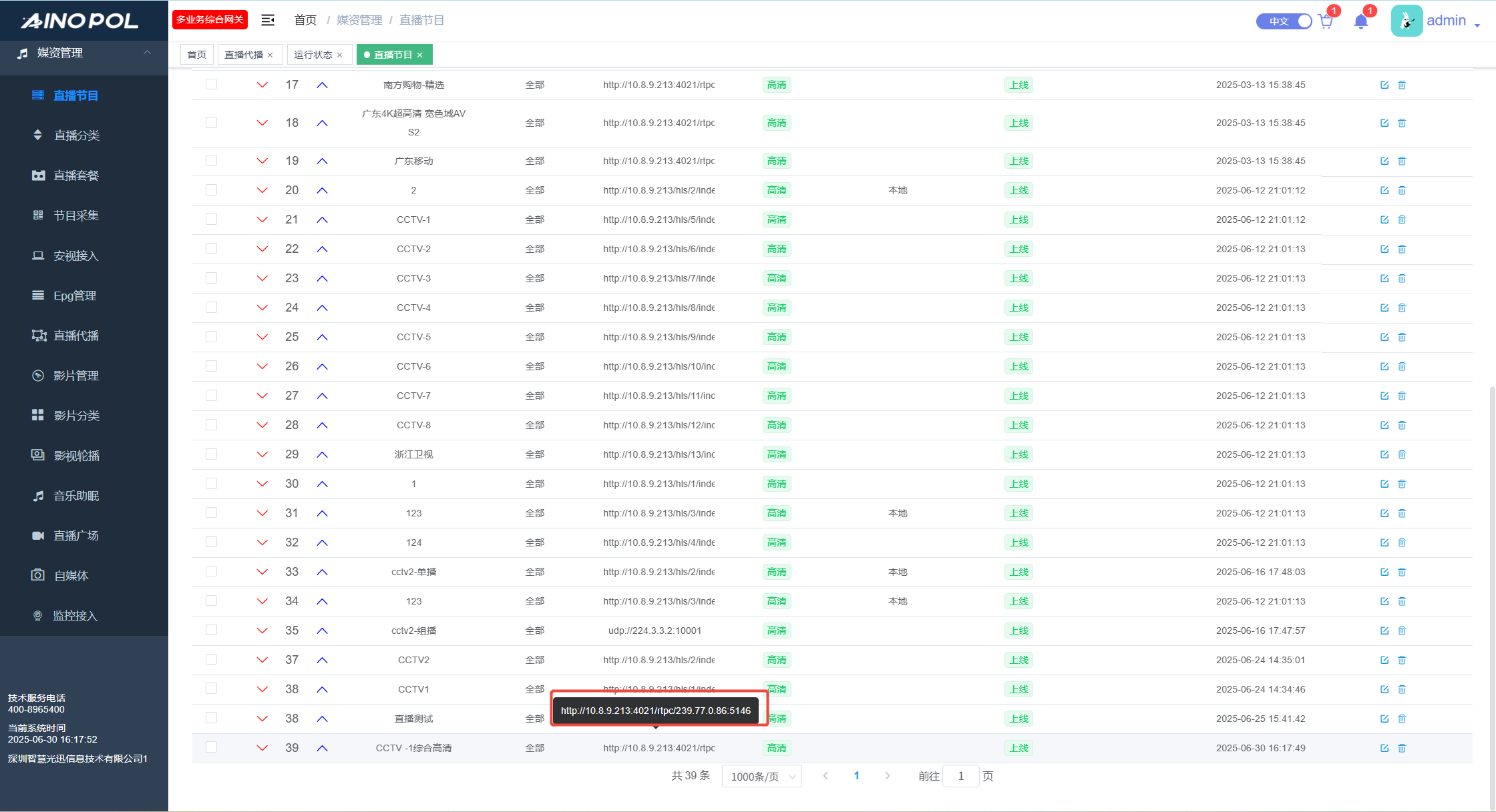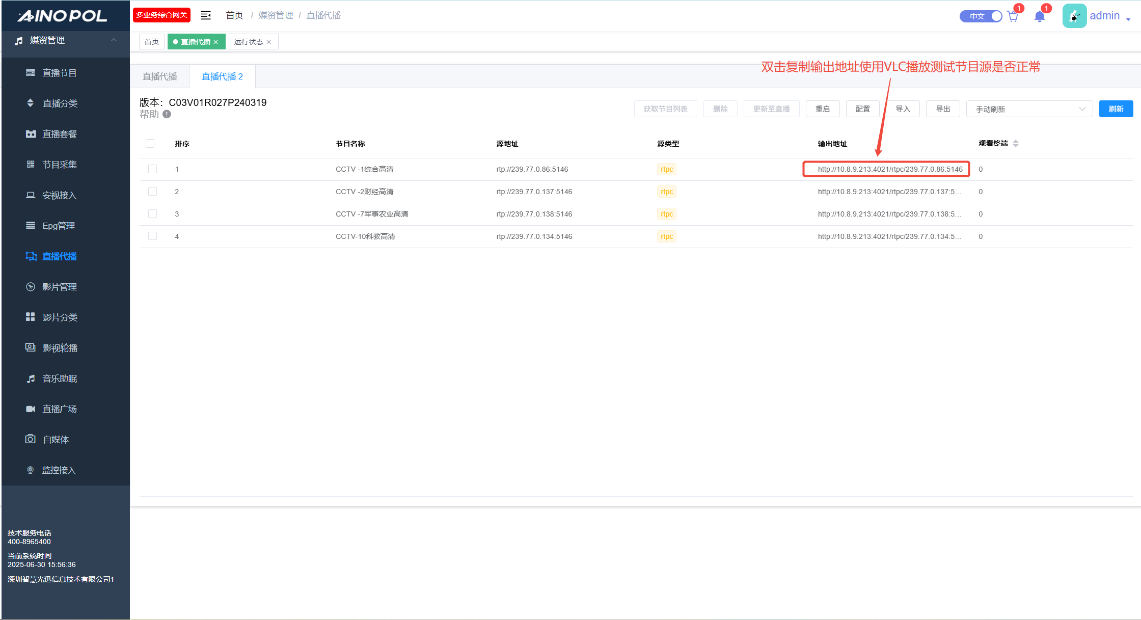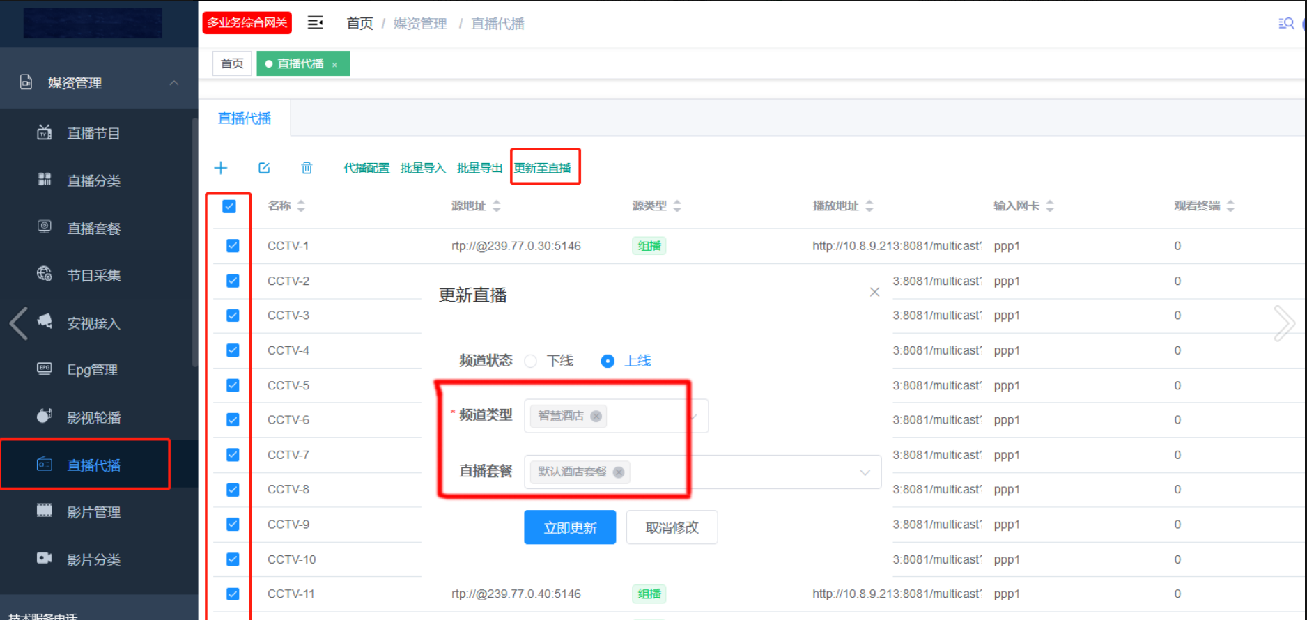 【产品教程】-基础 2025.06.30 XOS综合网关-媒资板块-直播业务-直播代播V2 操作背景:当运营商IPTV线路不够的情况下可以使用直播代播填充IPTV线路不足的情况需要较多的节目数量,可以使用直播代播进行采集节目。 1\\操作步骤 将IPTV线路接入到综合网关的网口 补充说明: (1)可支持获取协议:RTP 、 UDP 、HLS (2)协议匹配类型:RTP=rtpcrtp 最好采用 rtpc UDP=udp HLS=r 输出地址类型:[http://172.19.1.9:4021/rtpc/239.76.253.151:9000/ppp1](http://172.19.1.9:4021/rtpc/239.76.253.151:9000/ppp1) 172.19.1.9 服务器地址 4021 默认端口号(固定) rtpc 类型 \[rtprtpcudp\] 239.76.253.151:9000 源地址 ppp1 采集网关接口 注意rtpc 针对于 RTP开头的协议RTP源地址会出现:  如图所示:组播端口号都是一样的,说明是是广播类型,所以需要使用rtpc如果使用rtp会出现录屏情况 rtp类型只适合源地址组播端口不同。 (2).HLS针对于r [http://172.19.1.9:4021/r/http://10.8.9.213/hls/1/index.m3u8](http://172.19.1.9:4021/r/http://10.8.9.213/hls/1/index.m3u8) 将对应地区以及运营商的节目源整理成exle表格进行导入  批量导入节目列表到“直播代播V2”选择对应的网卡进行采集并测试是否采集成功   将采集的节目同步至直播节目  打开电视查看直播节目是否正常观看(同步成功后,会有节目列表)  故障排查 (如无法解决请联系人工客服) 电视节目黑屏,内网使用VLC播放直播列表的源地址查看服务器输出正常 服务器输出正常,电视机开启软解进行解决